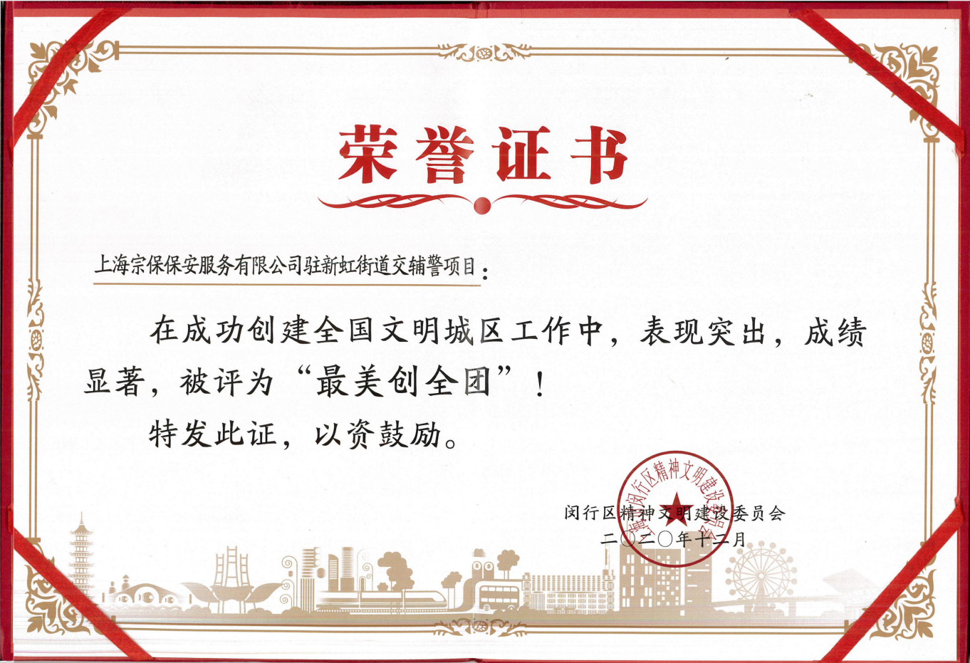 1月7日,閔行區召開(kāi)鞏固提升全國文明城區建設工作大會(huì ),宗保公司駐新虹街道交管輔警項目表現突出,被評為“最美創(chuàng )全團”。