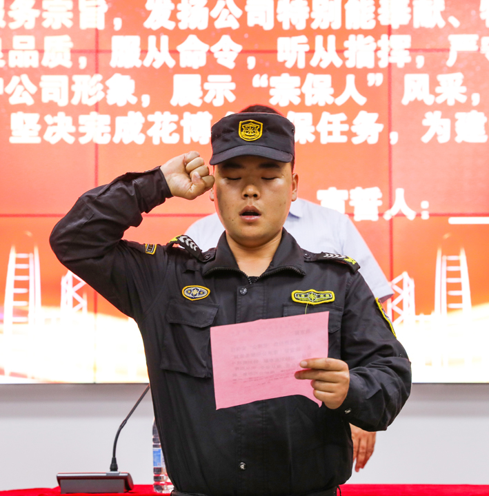 會(huì )上,副總經(jīng)理侯留勇對公司參與第十屆花博會(huì )安保人員進(jìn)行動(dòng)員,組織大家認真學(xué)習第十屆中國花卉博覽會(huì )執行委員會(huì )的相關(guān)工作部署,要求全體參與花博會(huì )安保人員胸懷大局、不辱使命,服從命令、聽(tīng)從指揮,齊心協(xié)力、全力以赴,堅決完成好花博會(huì )執委會(huì )賦予的各項安保工作任務(wù),展現宗保公司員工良好的精神面貌。隨后,全體隊員舉起右手,莊嚴宣誓,“我志愿擔負‘花博會(huì )’安保任務(wù),秉承公司服務(wù)宗旨......”