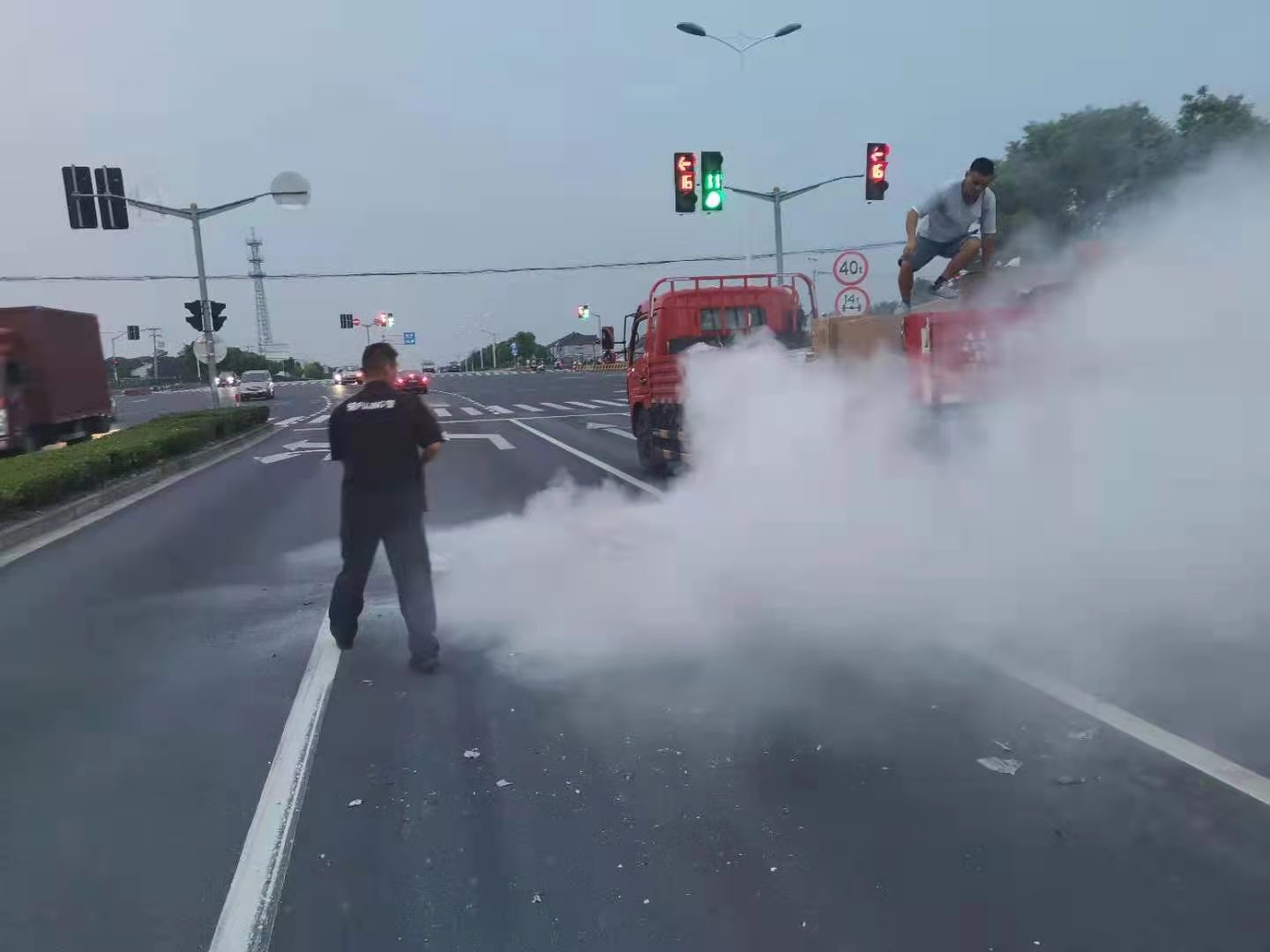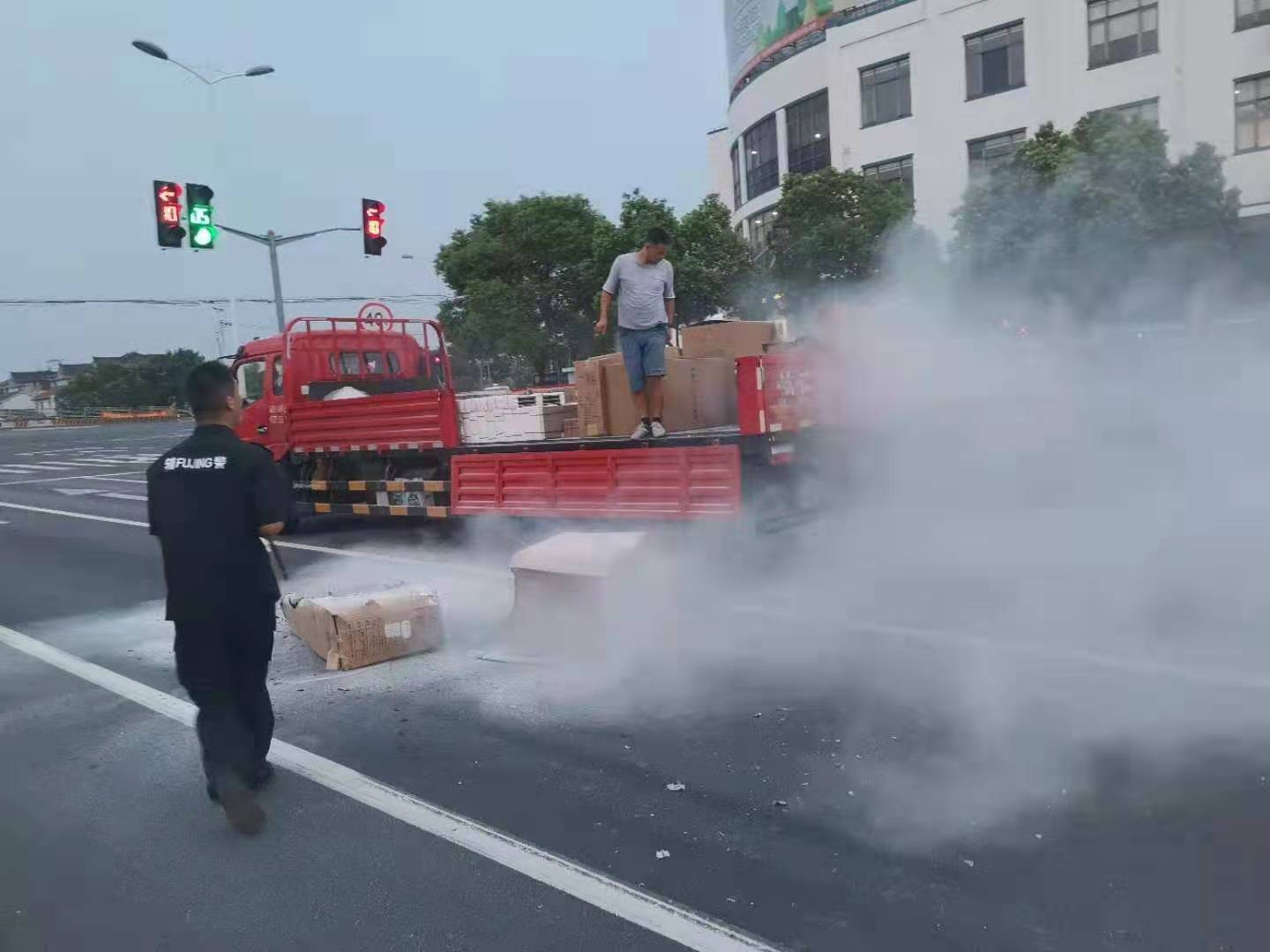 當天18:30左右,宋其波下班后在宿舍門(mén)口休息時(shí),突然發(fā)現下鹽路與申江路紅綠燈處,一輛紅色大貨車(chē)車(chē)上的貨物著(zhù)火了。