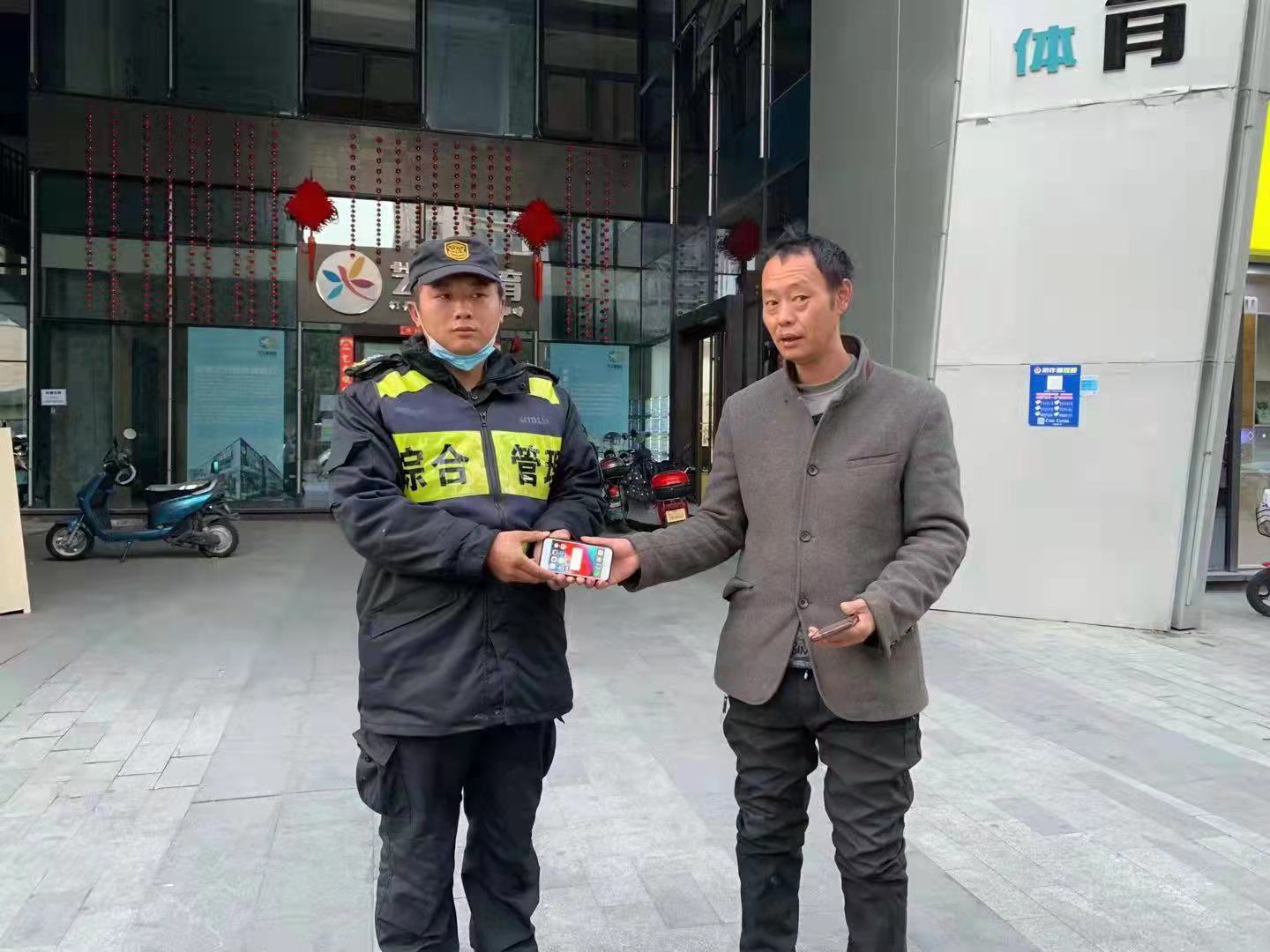 當日15:00,鄭之元在良渚街道北宸之光小區外圍巡查時(shí),撿到一部蘋(píng)果手機,便立即上報項目隊長(cháng),并按指示尋找失主。