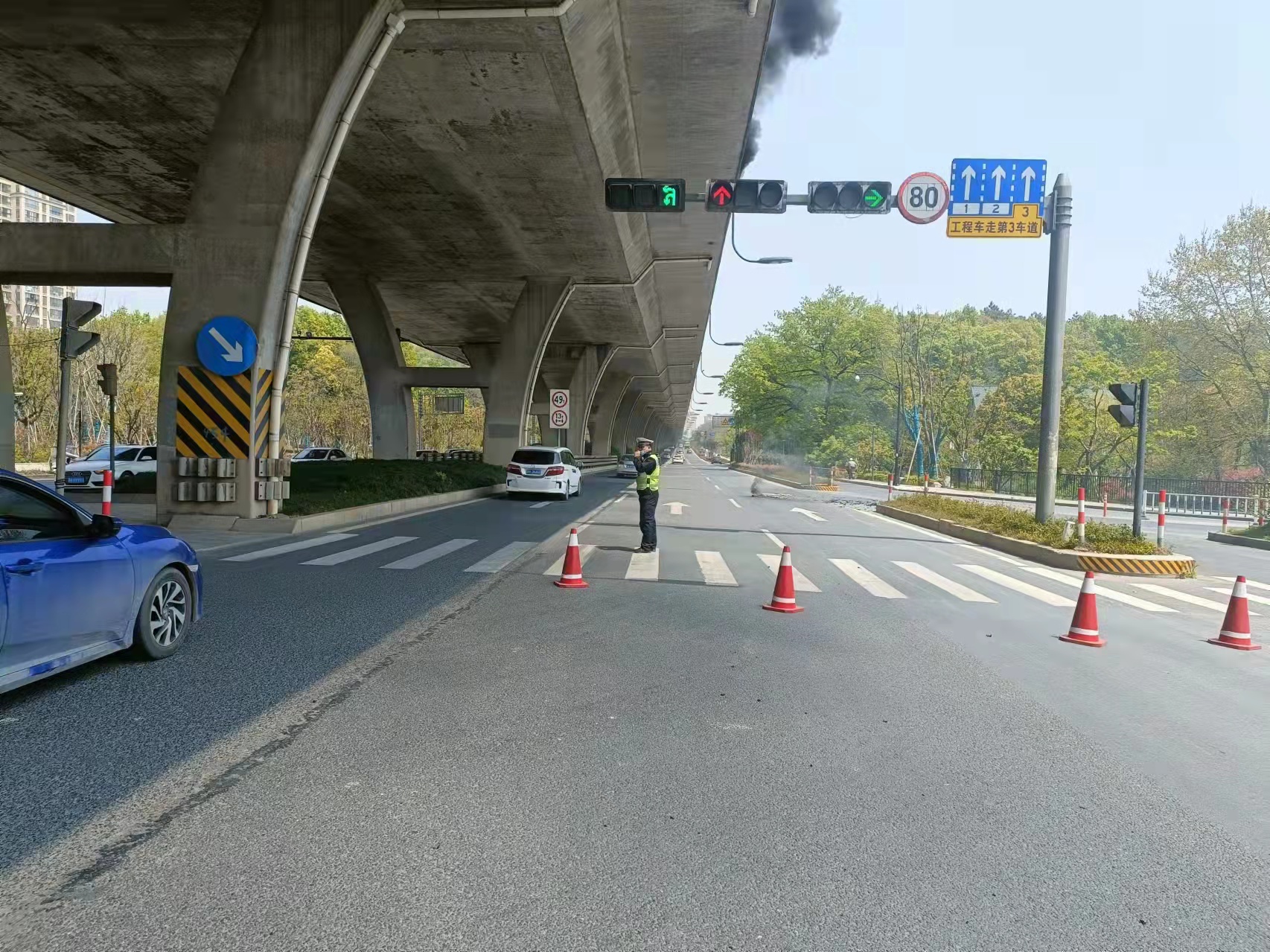 當幾個(gè)人趕到高架橋下時(shí),發(fā)現高速隔離板處有明火在燃燒,玻璃碎渣不時(shí)掉落下來(lái),橋下情況十分危險。見(jiàn)此情形,馮奧立即將情況上報工作站值班領(lǐng)導,協(xié)助引導路面車(chē)輛避開(kāi)繞行,安排同事封閉右轉專(zhuān)用車(chē)道,避免過(guò)往車(chē)輛和行人受到傷害。