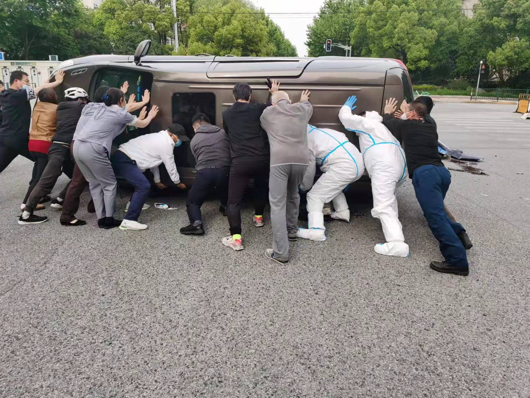 5月1日,宗保公司駐陸家嘴嶗山項目隊員路遇一起車(chē)輛側翻事故,協(xié)力將被困駕駛員救出。