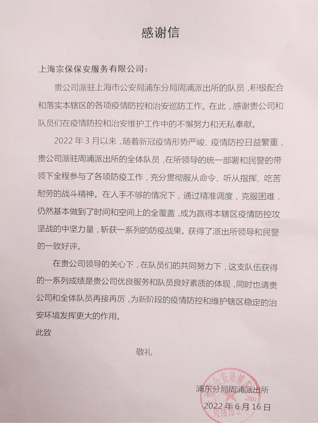 6月16日,宗保公司收到浦東公安分局周浦派出所的感謝信,信中對公司員工在疫情防控期間的辛勤付出和無(wú)私奉獻給予充分肯定,并表示衷心感謝。