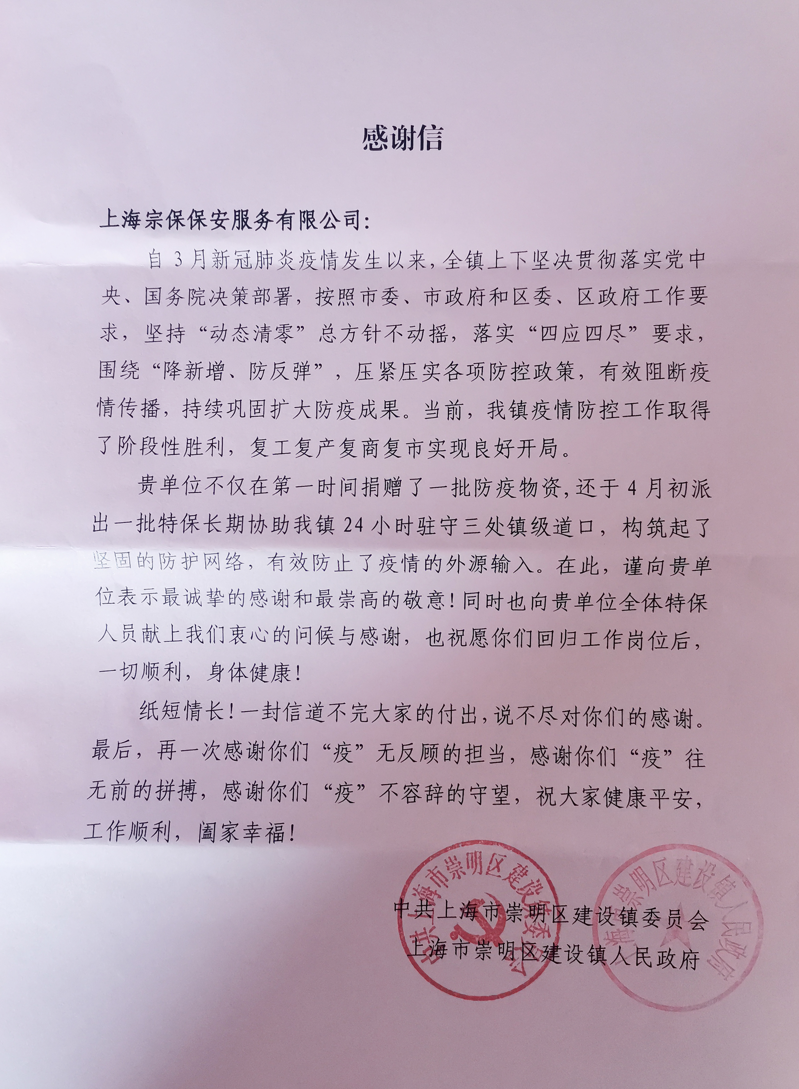 6月30日,中共上海市崇明區建設鎮委員會(huì )和崇明區建設鎮人民政府送來(lái)感謝信,對宗保公司全力協(xié)助建設鎮開(kāi)展疫情防控工作表示感謝。
