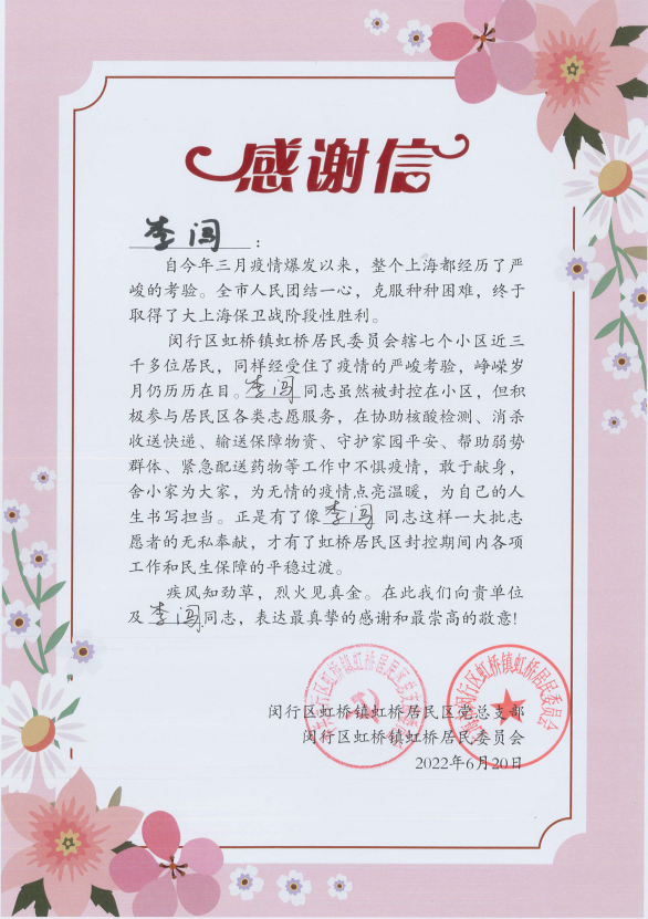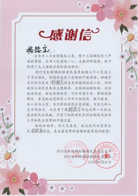 6月30日,閔行區虹橋鎮虹橋居民區黨總支部和閔行區虹橋鎮虹橋居民委員會(huì )送來(lái)感謝信,真摯地感謝疫情防控期間宗保員工全力配合居委開(kāi)展疫情防控所做的工作。