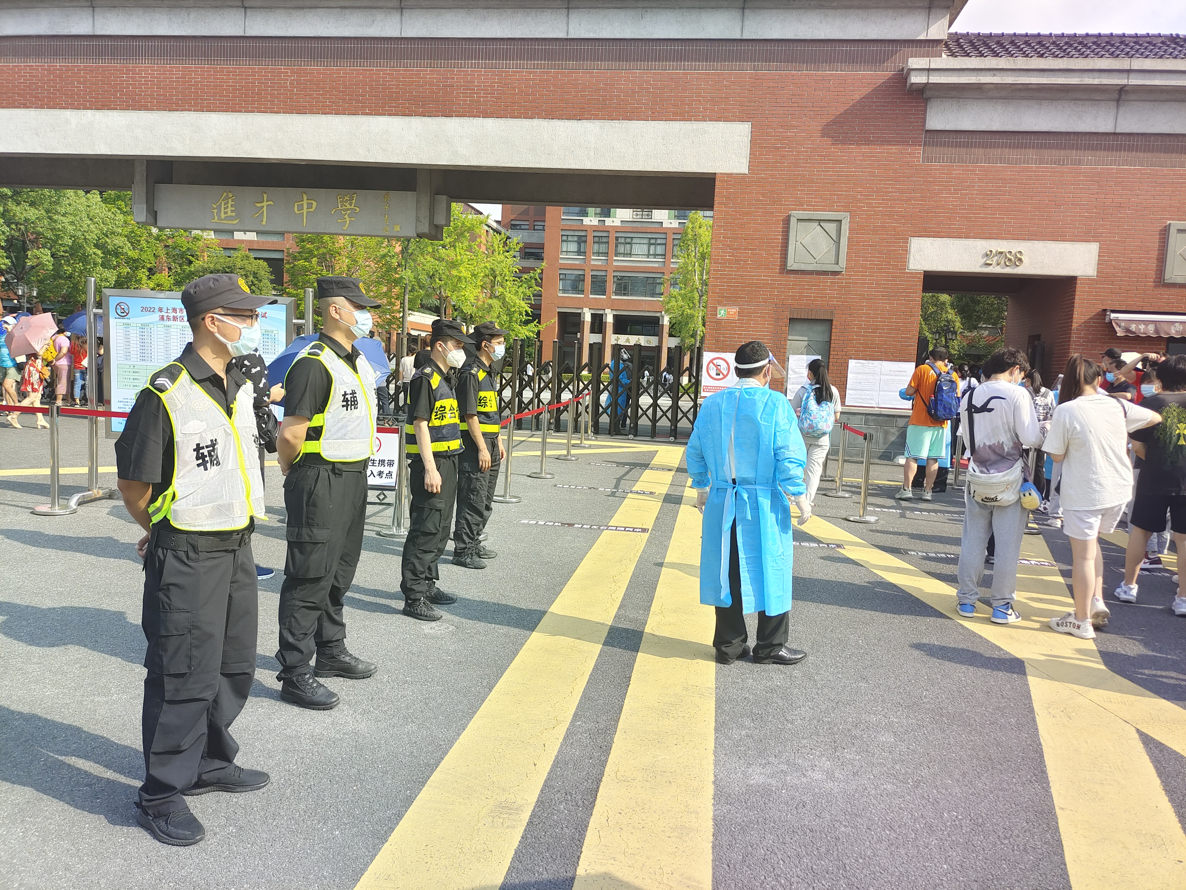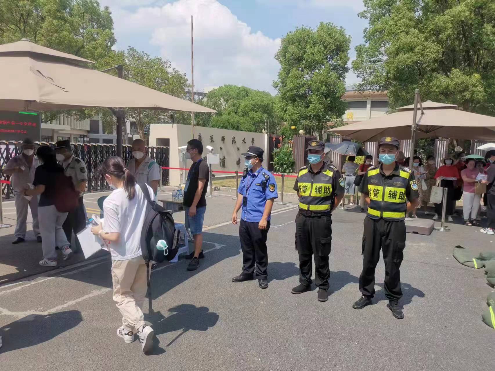 7月7日起,上海市陸續迎來(lái)了2022年普通高校招生全國統一考試和2022年初中學(xué)業(yè)水平考試。宗保公司承擔了建平中學(xué)、進(jìn)才中學(xué)、周浦中學(xué)、吳迅中學(xué)、滬東長(cháng)島中學(xué)、楊思高級中學(xué)、南匯一中、南匯中學(xué)、閔行外國語(yǔ)中學(xué)等17個(gè)考點(diǎn)的秩序維護任務(wù),配合轄區公安機關(guān)、校方維持各考點(diǎn)高考和中考秩序。