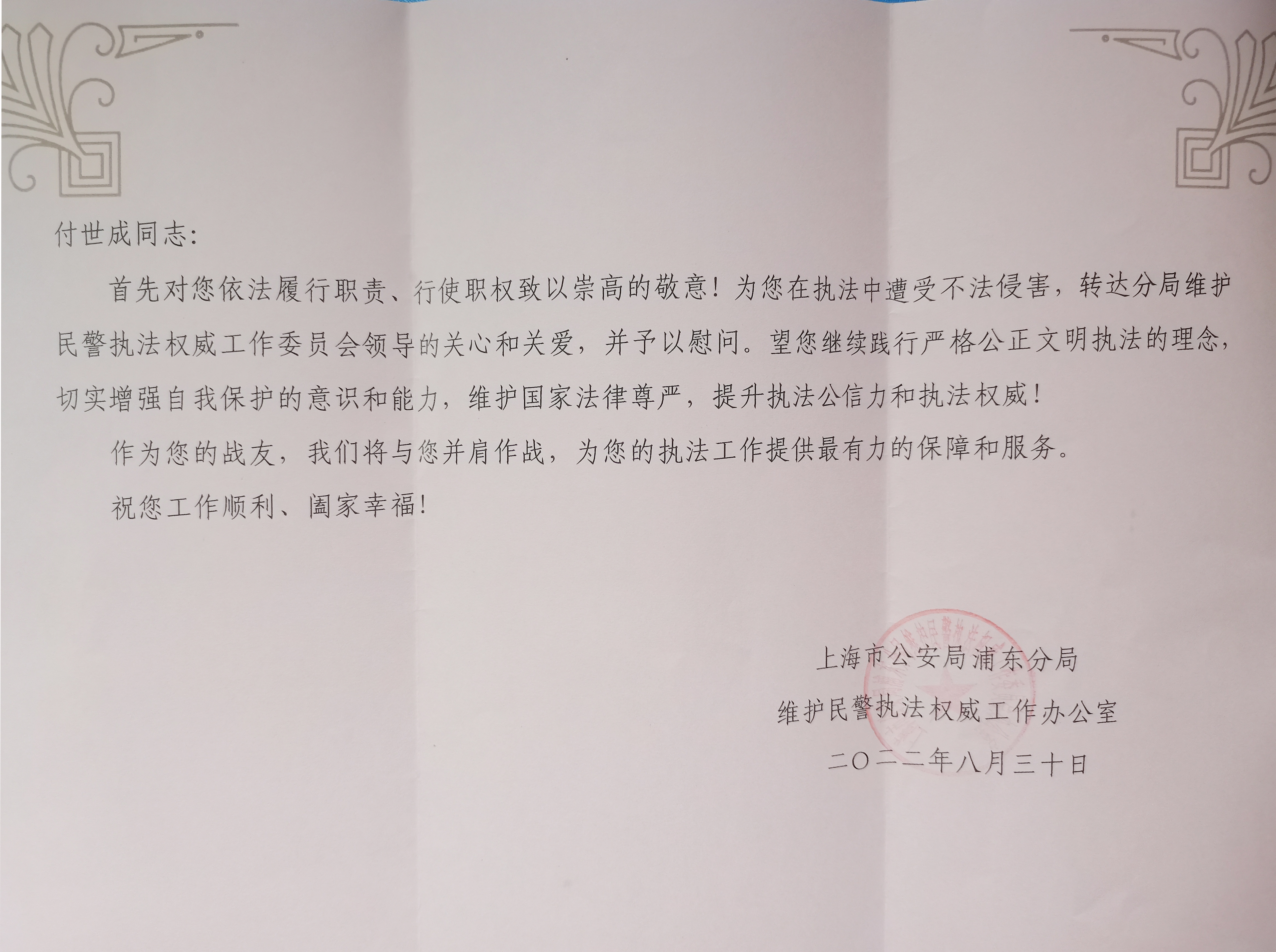 宗保公司員工付世成在工作中主動(dòng)作為、勇于作為、善于作為的出色表現,得到了洋涇派出所領(lǐng)導的肯定,受到了上海市公安局浦東分局的來(lái)信表?yè)P。