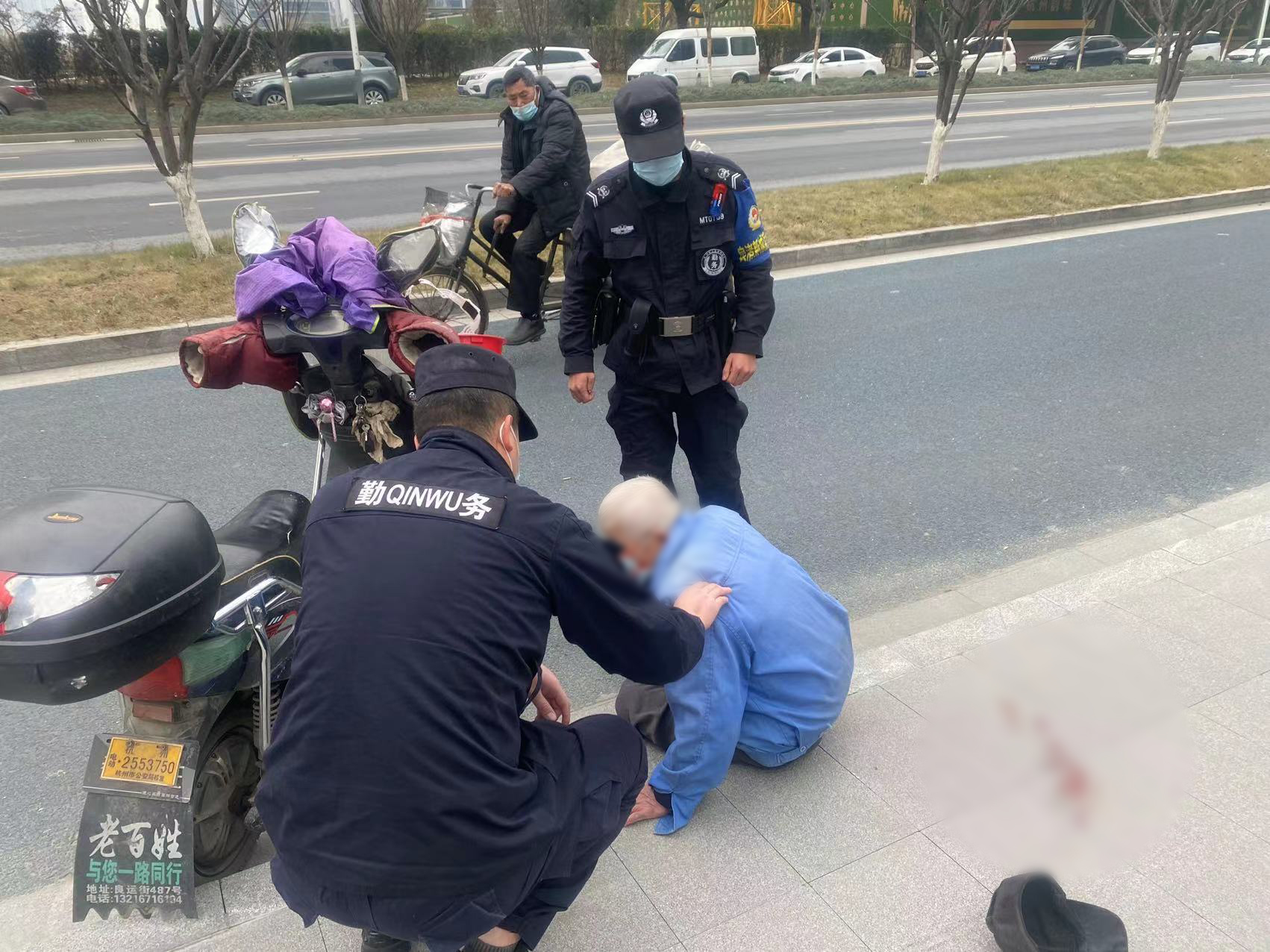 當日13:40,公司員工姜航和凌紹凱駕駛巡邏車(chē)在良渚新城好運街與小洋壩路附近巡邏時(shí),發(fā)現一位老人摔倒在地,一輛電瓶車(chē)壓在老人的身上。