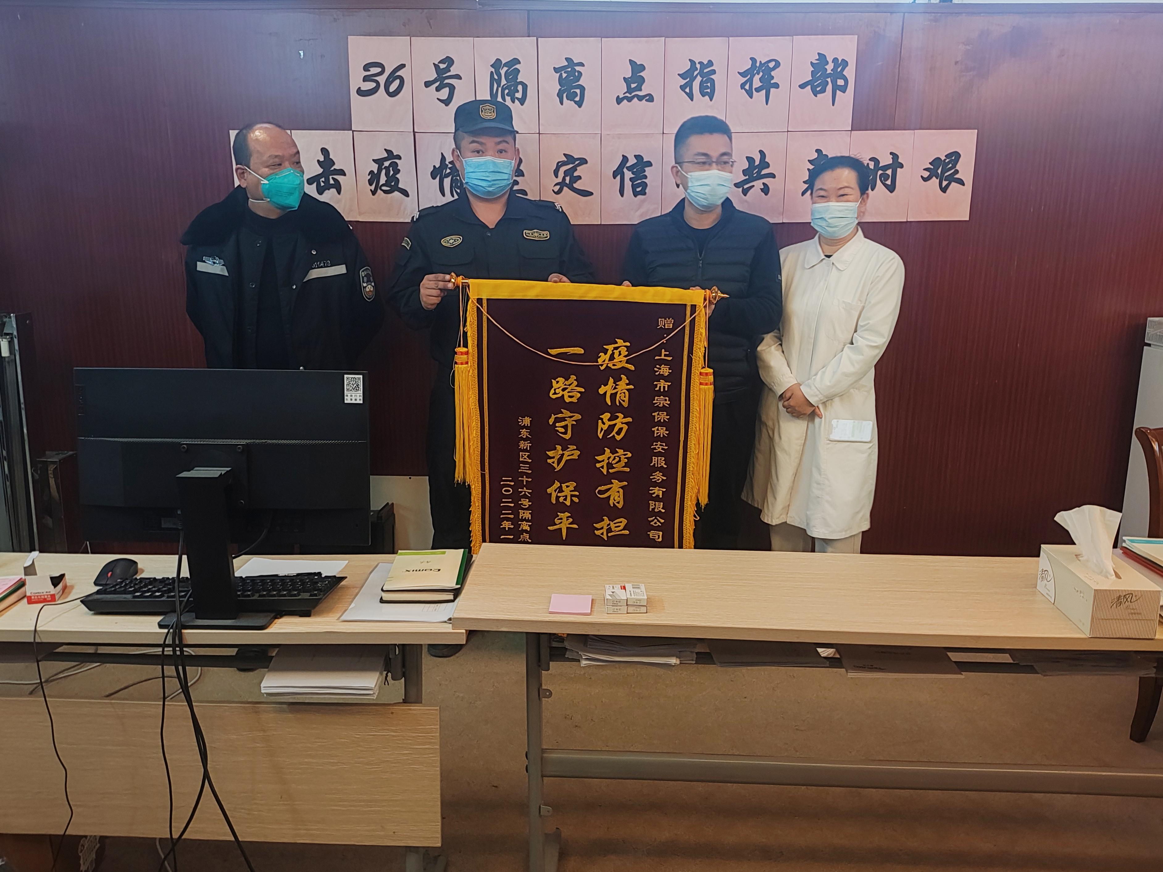 12月21日,宗保公司駐36號疫情防控隔離點(diǎn)項目收到維也納酒店點(diǎn)位長(cháng)送來(lái)的一面繡有“疫情防控有擔當 一路守護保平安”的錦旗,感謝宗保公司對其工作的大力支持。