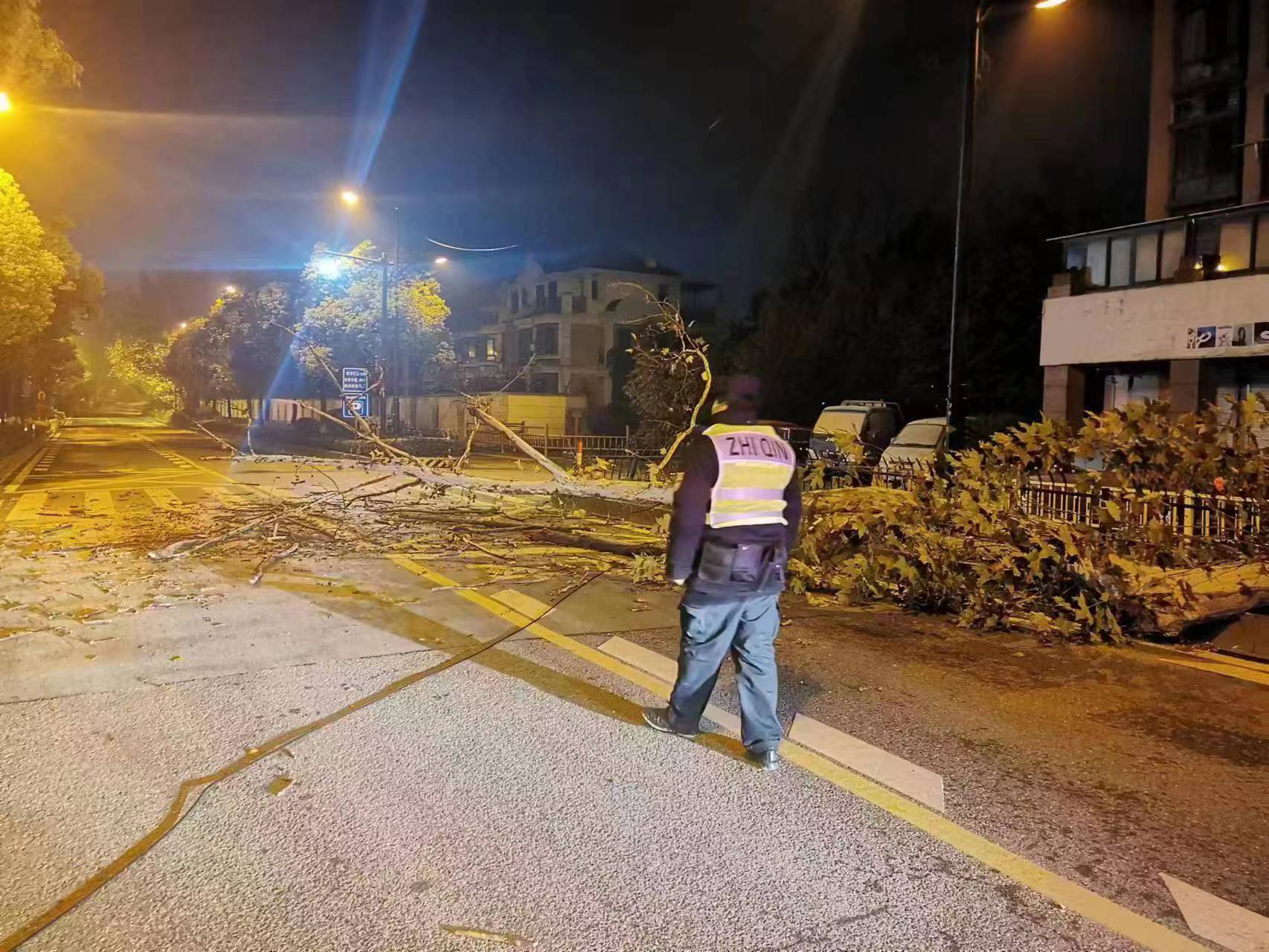 兩人迅疾來(lái)到現場(chǎng),一棵大樹(shù)折斷后橫在馬路上,凌亂的枝干正好將馬路攔腰截斷,車(chē)輛通行嚴重受阻。由于時(shí)值凌晨,附近商戶(hù)沒(méi)有開(kāi)門(mén),兩人也無(wú)排障工具,于是就在現場(chǎng)設立了警戒線(xiàn),向指揮中心報告情況并呼叫增援。