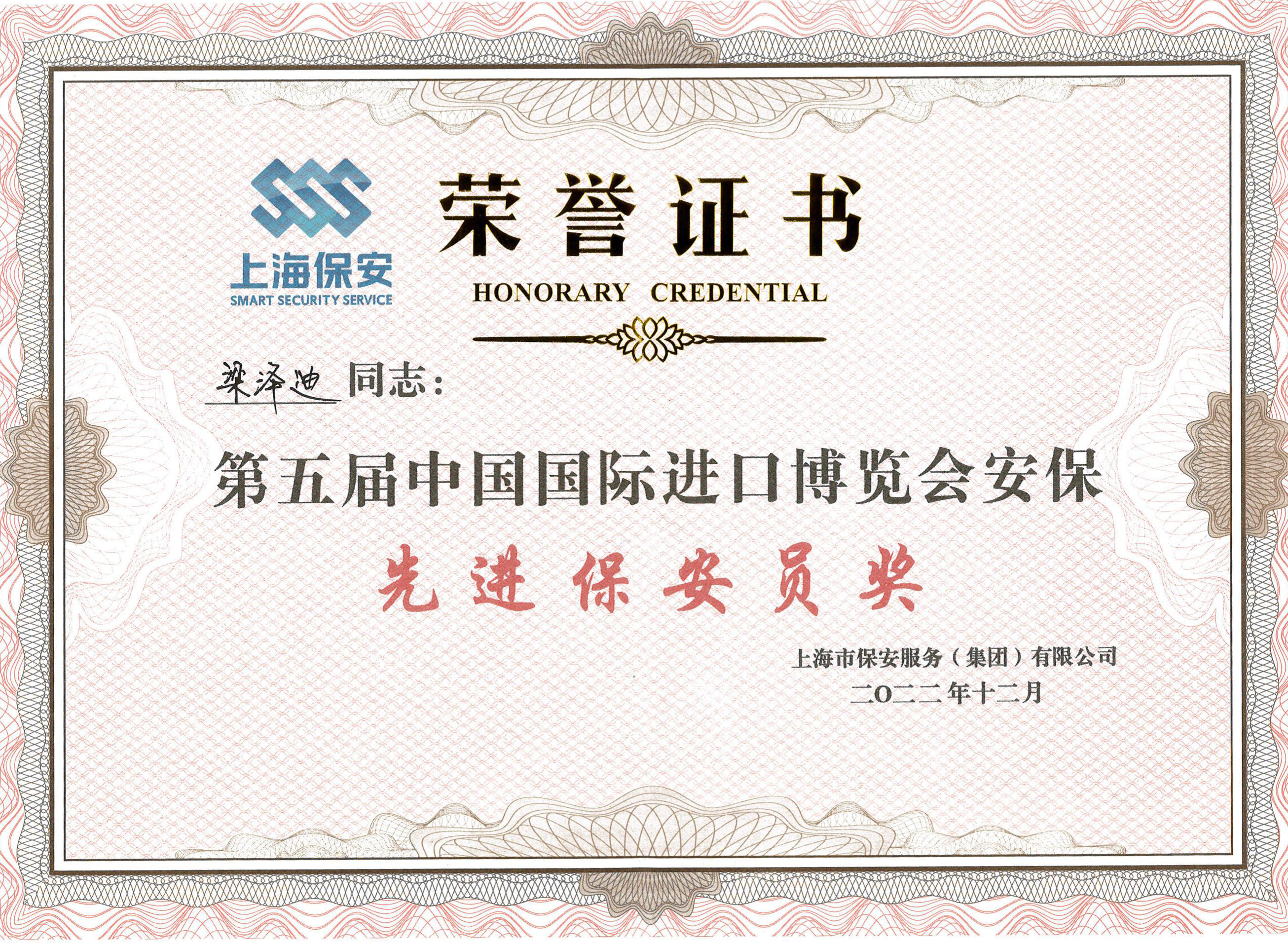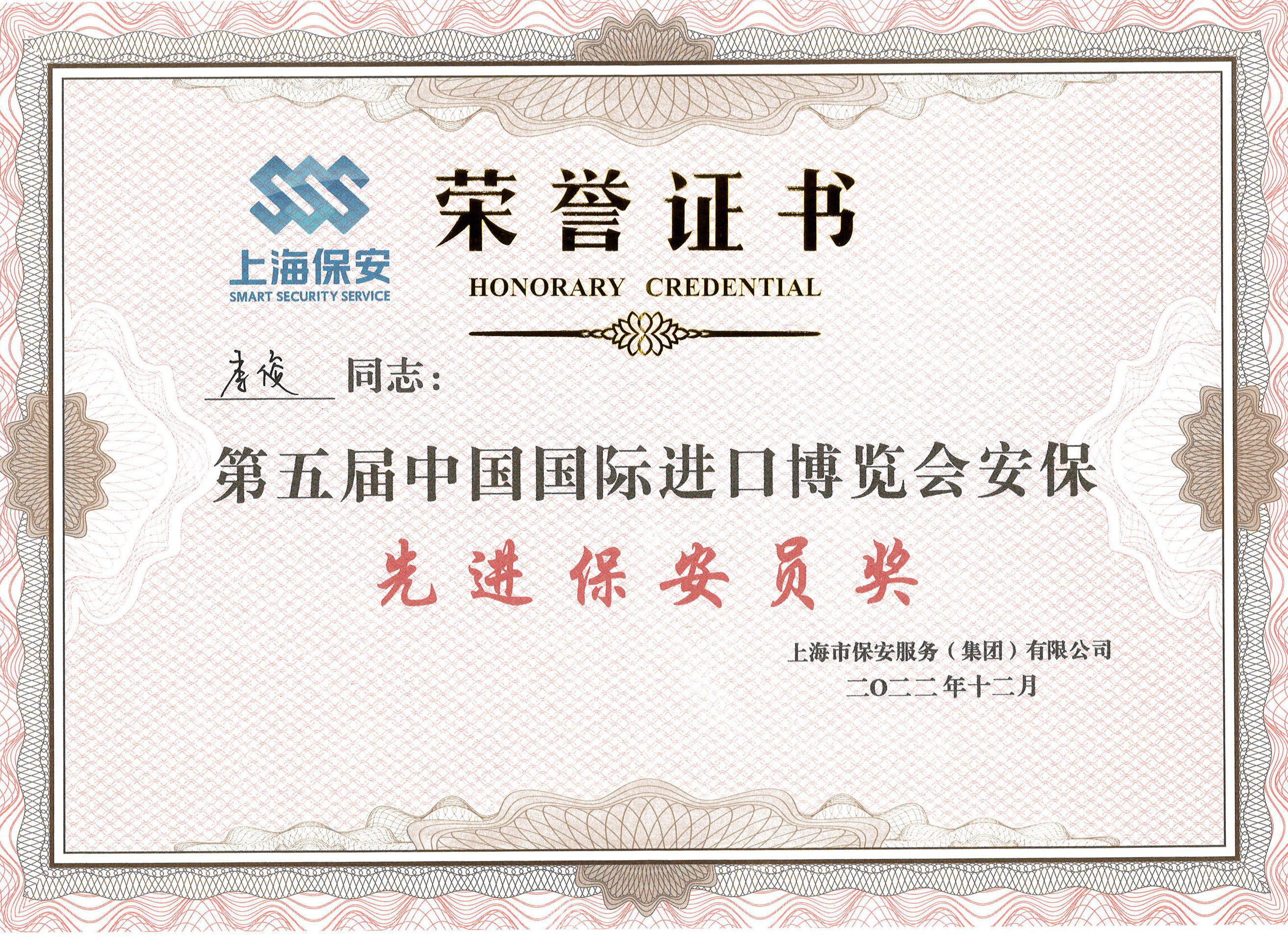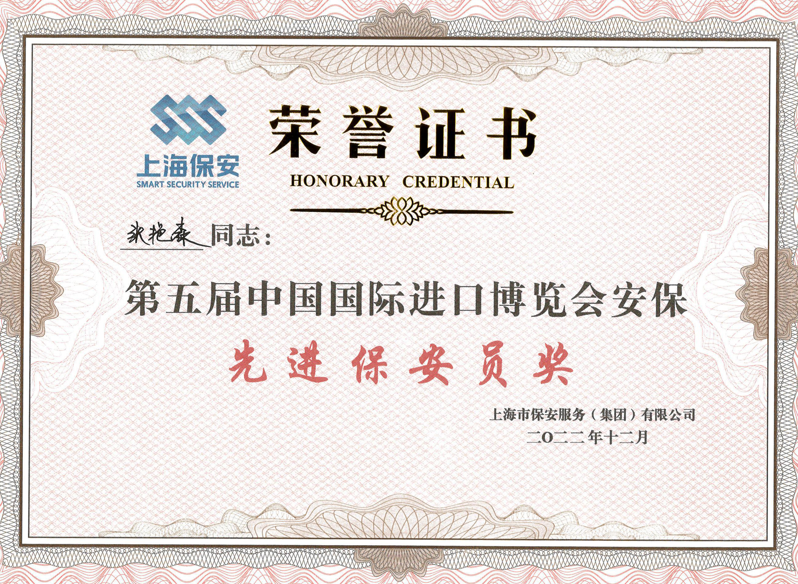 近日,上海市保安服務(wù)(集團)有限公司對參加第五屆中國國際進(jìn)口博覽會(huì )的保安員進(jìn)行了表彰。公司員工梁澤迪、錢(qián)力豪、劉世洋、宋琳、李帥、李俊、鄭光鑫和張艷森因工作表現突出,榮獲第五屆中國國際進(jìn)口博覽會(huì )安?!跋冗M(jìn)保安員獎”。