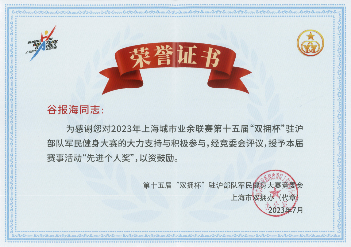 中國人民解放軍建軍96周年之際,為進(jìn)一步踐行習總書(shū)記關(guān)于雙擁工作和體育工作的重要論述,以黨的二十大精神為指導,由市擁軍優(yōu)屬擁政愛(ài)民工作領(lǐng)導小組辦公室、上海警備區政治工作局、市體育局、市擁軍優(yōu)屬基金會(huì )主辦的以“牢記使命礪精兵,健身強軍爭第一”為主題的第十五屆“雙擁杯”駐滬部隊軍民健身大賽,于6月27日至7月9日在軍地各單位駐地陸續展開(kāi),宗保公司作為退役軍人創(chuàng )辦企業(yè)參加大賽。