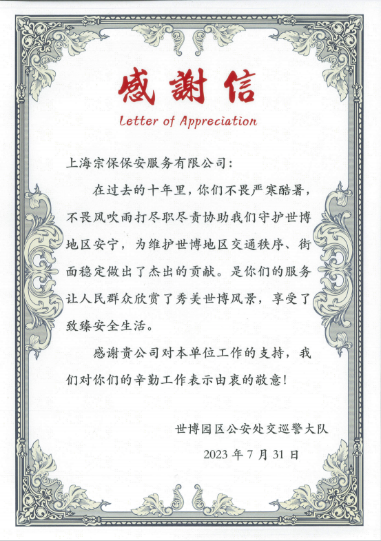 世博園區公安處交巡警大隊贈送錦旗致感謝信,是對公司駐世博園項目工作的充分肯定,既是一份榮譽(yù)和褒獎,更是一種激勵和鼓舞。員工們表示,將不辜負領(lǐng)導的期望,繼續保持和發(fā)揚扎實(shí)工作、愛(ài)崗敬業(yè)的工作作風(fēng),再接再厲,再創(chuàng )佳績(jì),為助力轄區平安建設續寫(xiě)新的篇章。