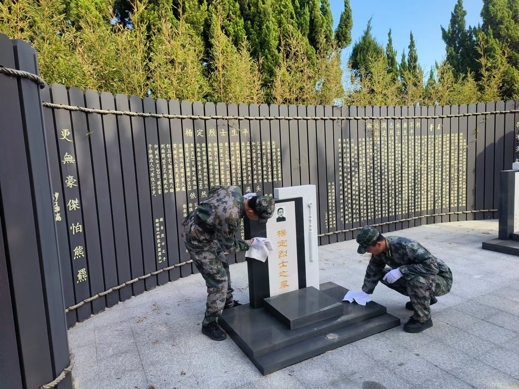 隨后,公司退役軍人員工志愿者們懷著(zhù)無(wú)比崇敬的心情,認真細致地擦拭紀念碑、烈士事跡碑,清理周邊雜草及落葉,用實(shí)際行動(dòng)緬懷、尊崇革命英烈,讓歷史永不褪色,讓烈士紀念碑永放光彩。