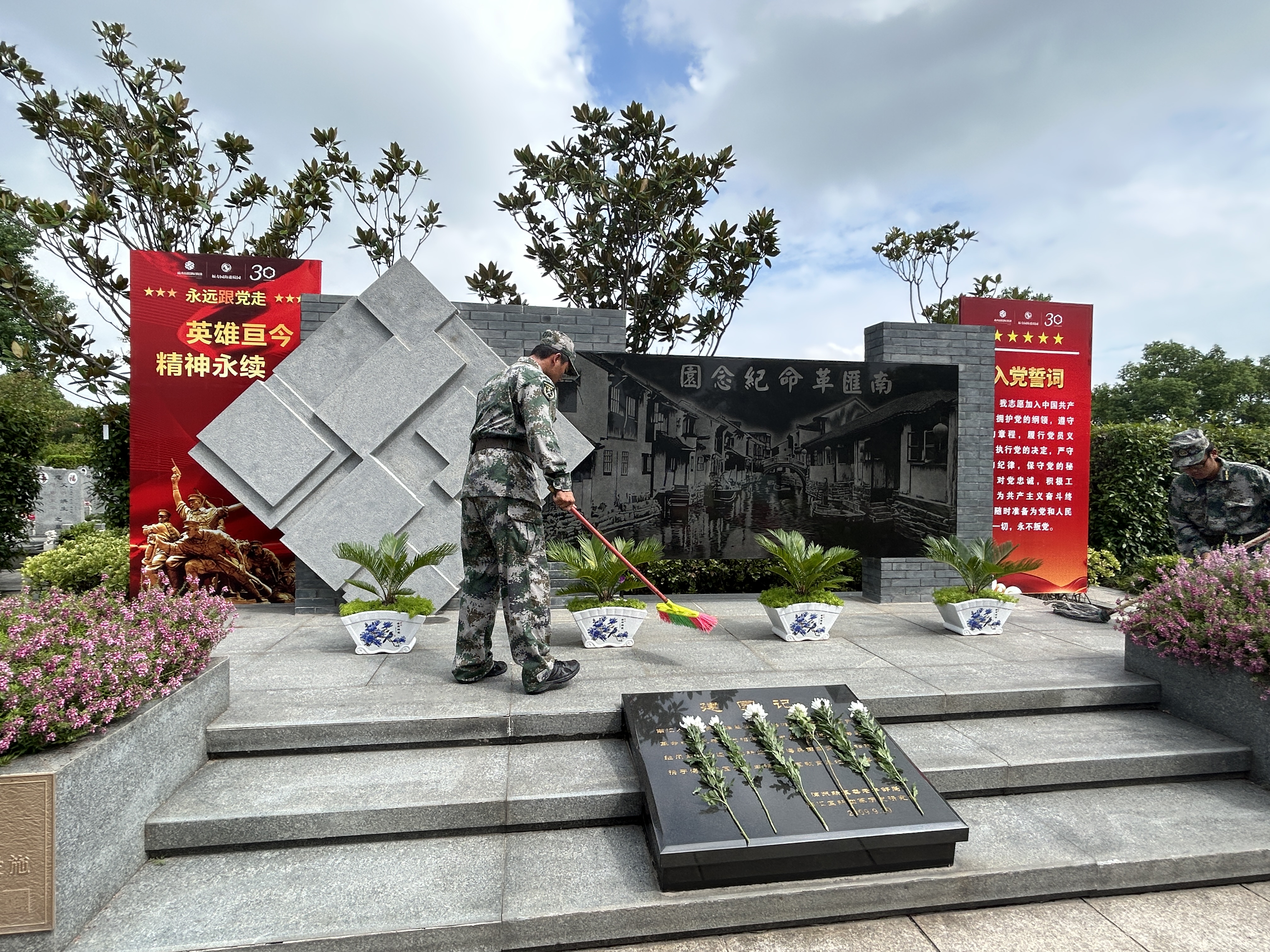 宗保公司退役軍人員工志愿者和浦東新區烈士紀念設施保護中心工作人員先后來(lái)到福壽園海港陵園、書(shū)院烈士紀念碑、南匯革命烈士紀念園、川沙烈士陵園等烈士設施祭掃。