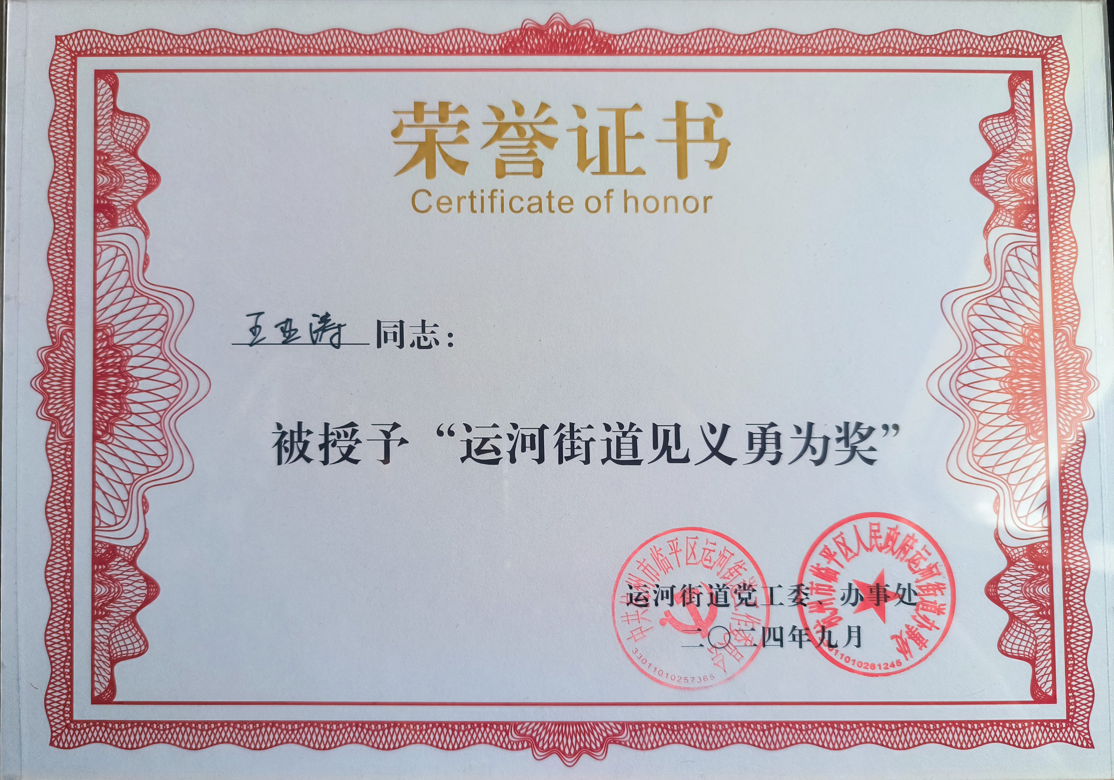 9月14日,浙江民泰公司駐杭州市臨平區運河市容項目3名員工被運河街道黨工委、辦事處授予“運河街道見(jiàn)義勇為獎”。