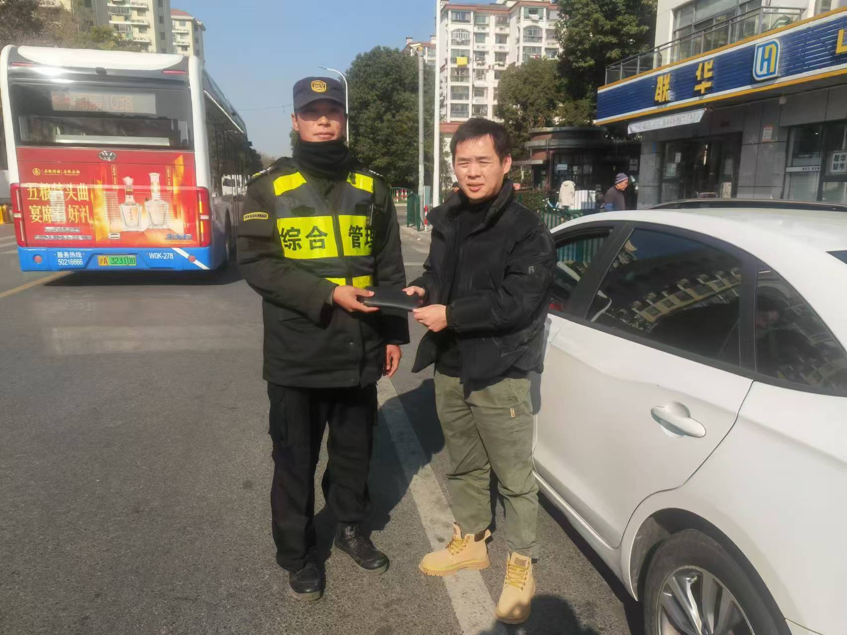 大約過(guò)了20分鐘,一位身穿黑色外套的男子急匆匆趕到現場(chǎng),盯著(zhù)地面來(lái)回細看,好像在尋找什么東西。陸成躍見(jiàn)狀主動(dòng)上前詢(xún)問(wèn),了解情況確認男子是失主后,就將錢(qián)包及錢(qián)物一并悉數交還給了男子。男子拿到錢(qián)物后,連連向宗保員工陸成躍表示感謝。