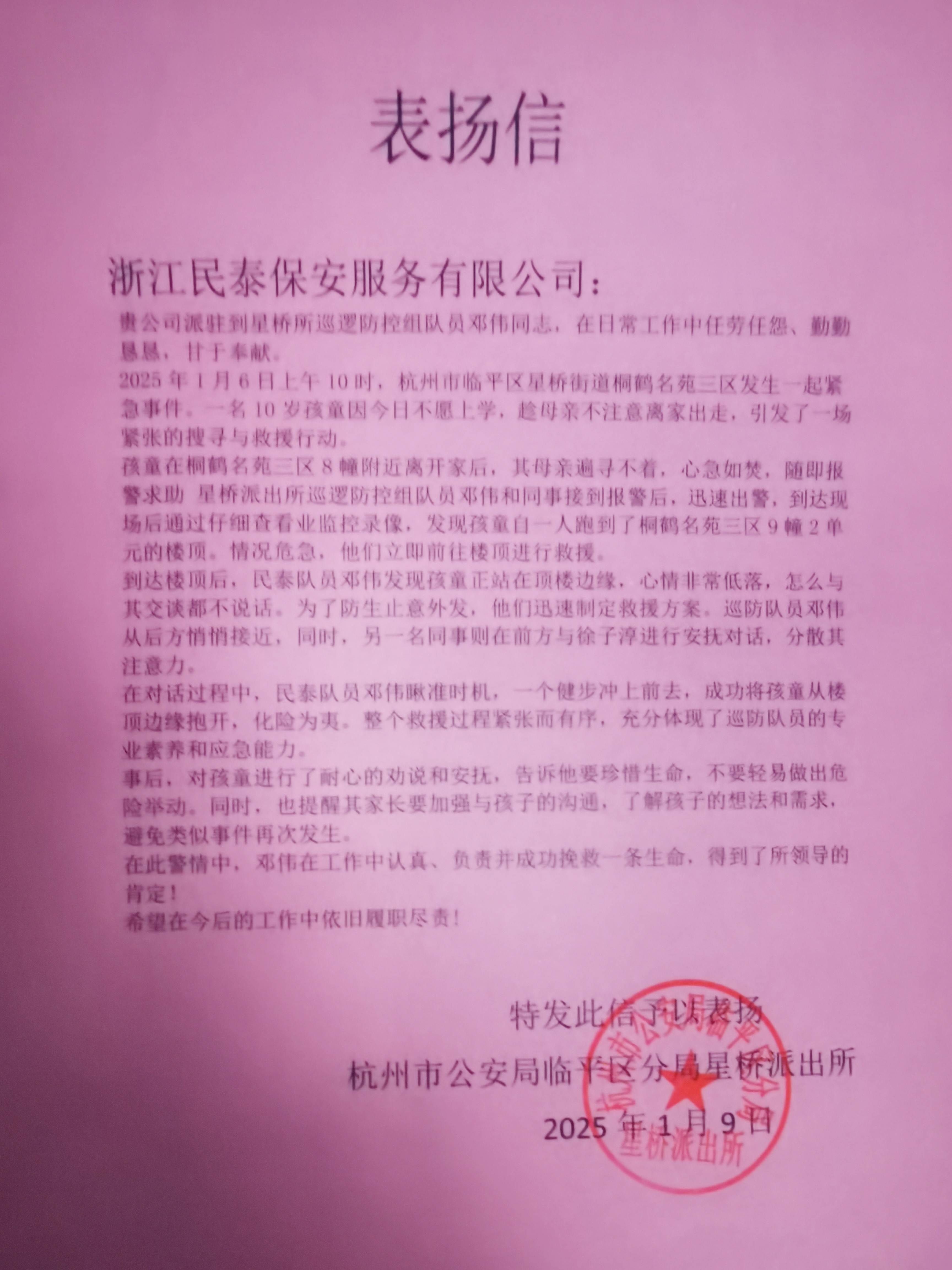 1月10日,浙江民泰公司收到杭州市公安局臨平區分局星橋派出所的一封表?yè)P信,信中感謝公司員工鄧偉成功救下一名欲跳樓輕生孩童,挽救其生命的行為,對公司員工鄧偉不顧安危、擔當善為的精神給予充分肯定和贊揚。
