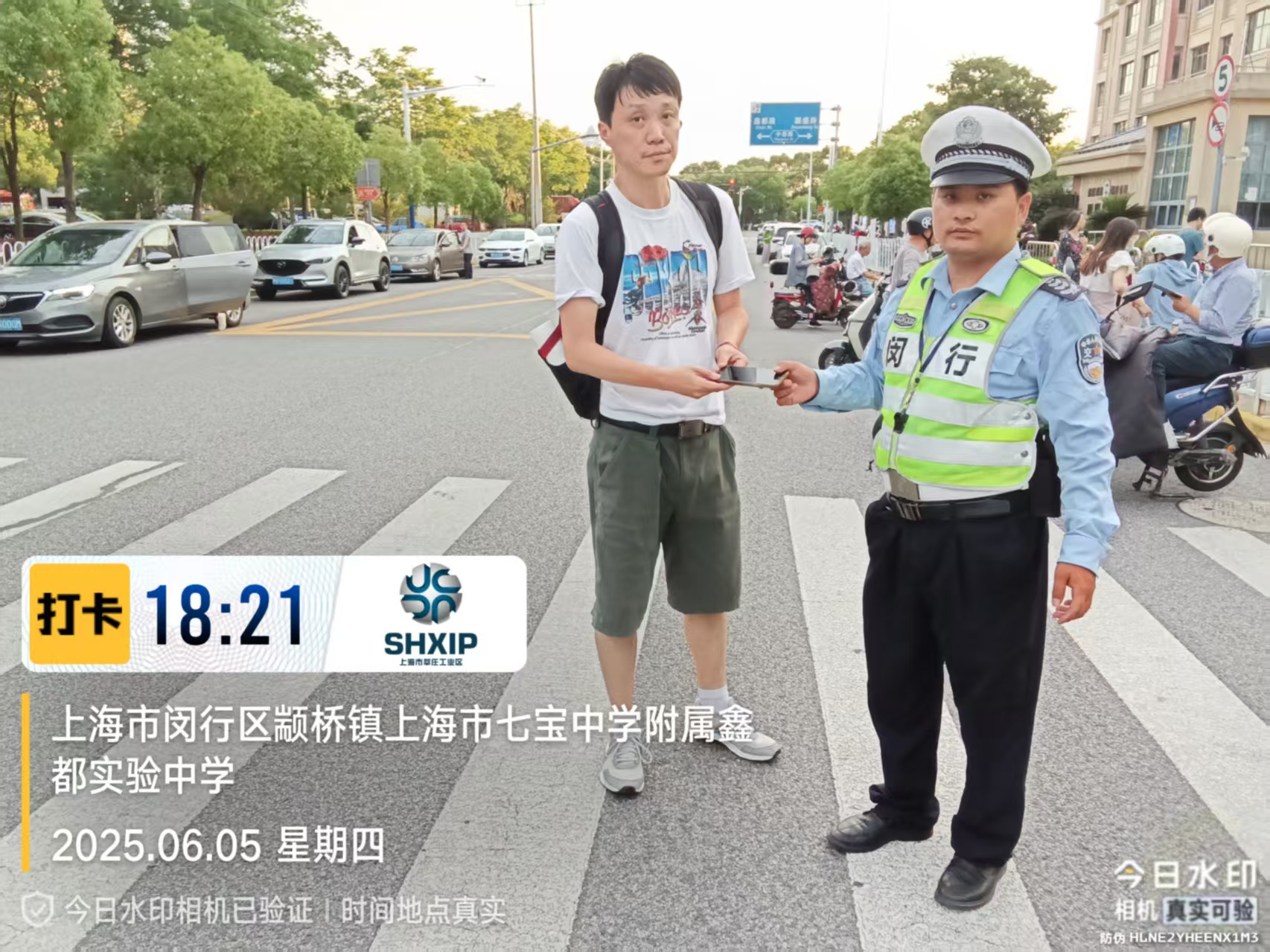6月5日18:00 ,宗保公司駐閔行區莘莊工業(yè)區項目員工龍彪在鑫都實(shí)驗中學(xué)護校時(shí),撿到一部華為手機,詢(xún)問(wèn)路人無(wú)人認領(lǐng)后,便在學(xué)校門(mén)口邊執勤邊等待失主。