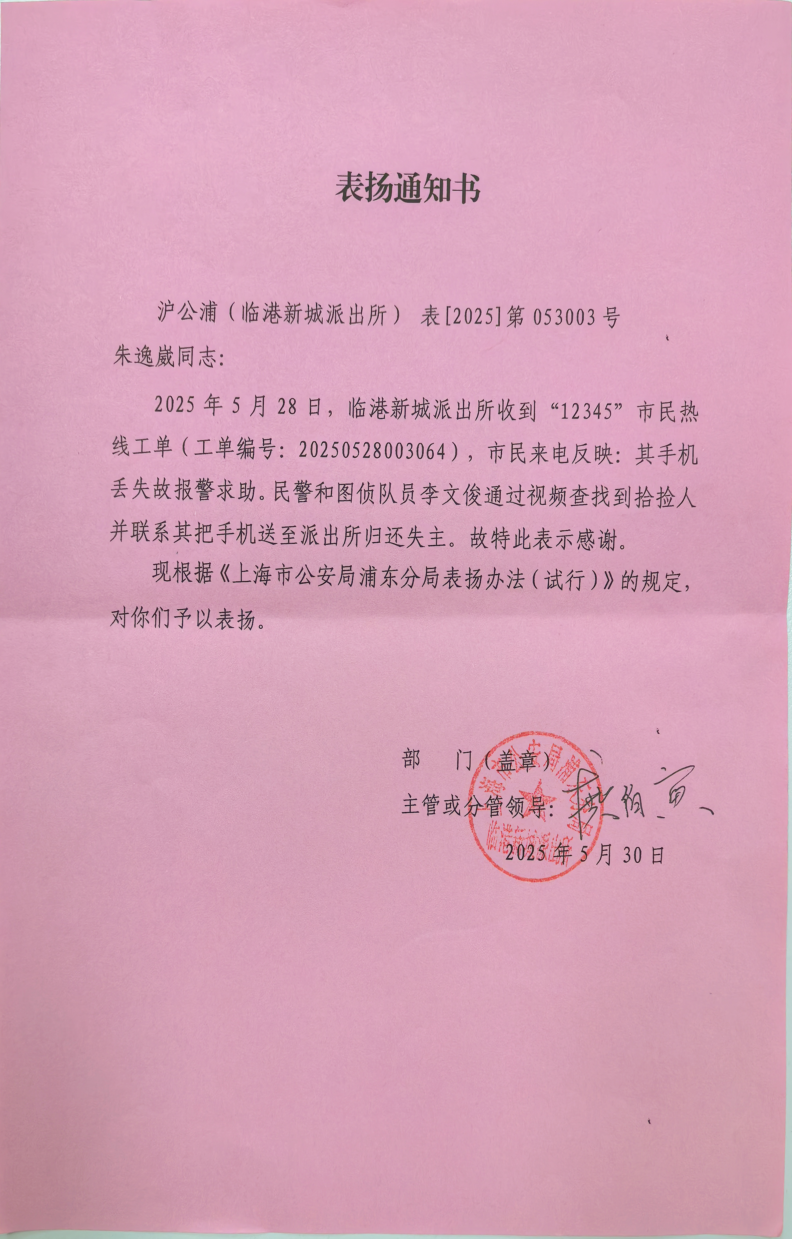 5月28日,找回手機的市民特意致電上海市民熱線(xiàn)12345,點(diǎn)名表?yè)P宗保公司員工李文俊高度的工作責任心和耐心細致的工作態(tài)度。李文俊的行動(dòng)充分展現了警務(wù)輔助人員認真負責、服務(wù)群眾的良好形象,也體現了宗保公司員工良好的職業(yè)素養和責任擔當。