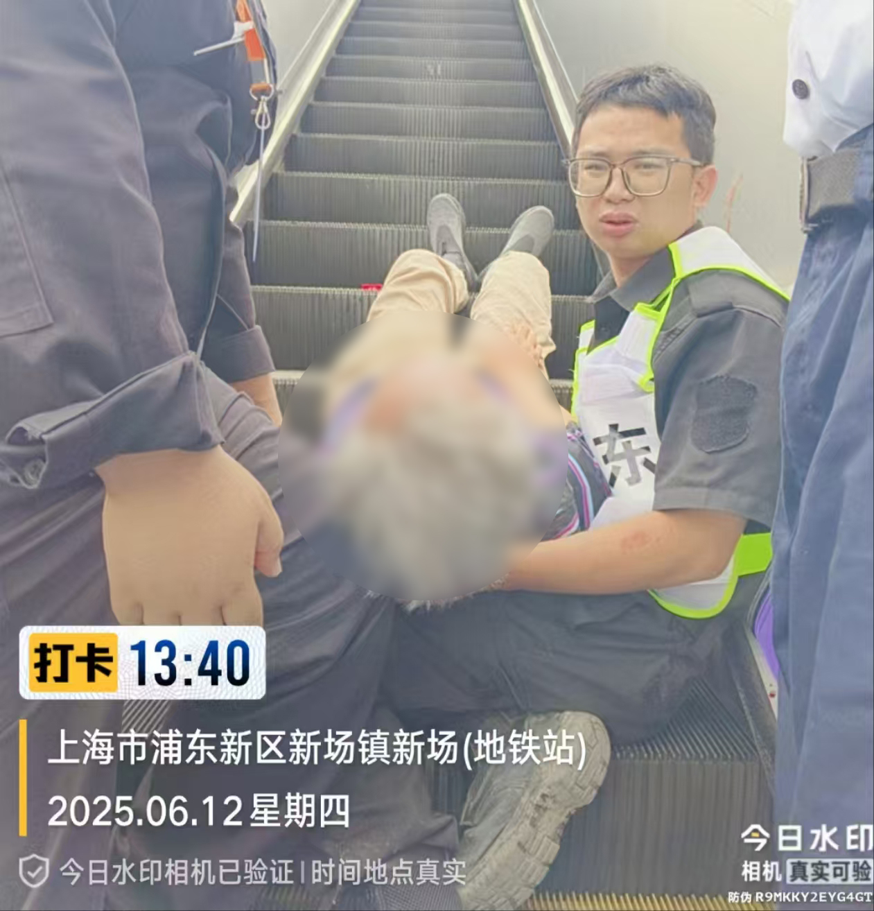 當日13:25,正在16號線(xiàn)新場(chǎng)地鐵站2號口附近巡邏的公司員工翟佳明,突然聽(tīng)到一陣急促的喊叫聲,來(lái)不及多想的他便立即循聲跑去。