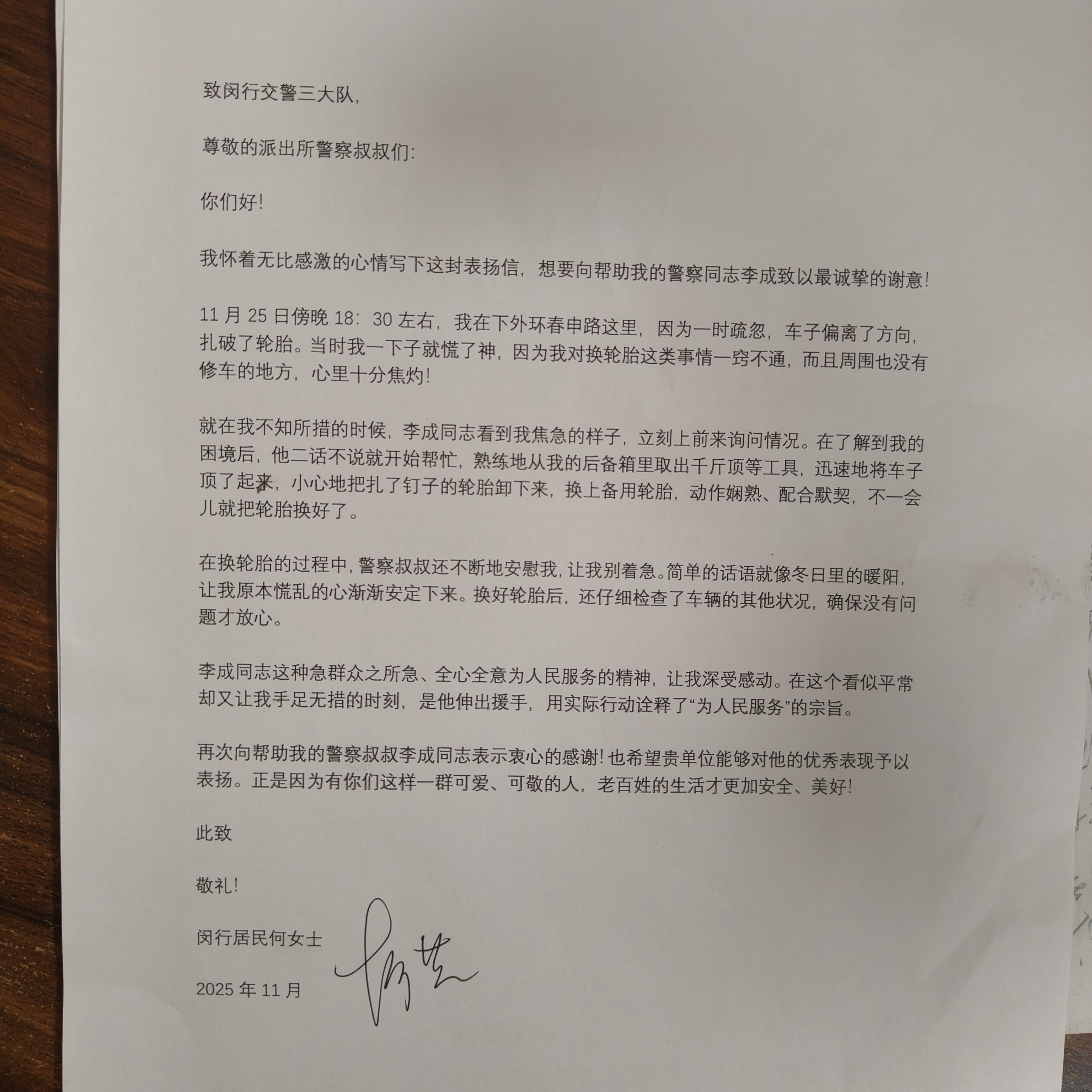 輪胎更換完畢后,李成又仔細檢查了車(chē)輛輪胎氣壓及其他關(guān)鍵部位,確認車(chē)輛無(wú)安全隱患后,才放心讓何女士駕車(chē)離開(kāi)。事后,何女士為表示感謝,特意送來(lái)一面錦旗表達謝意。