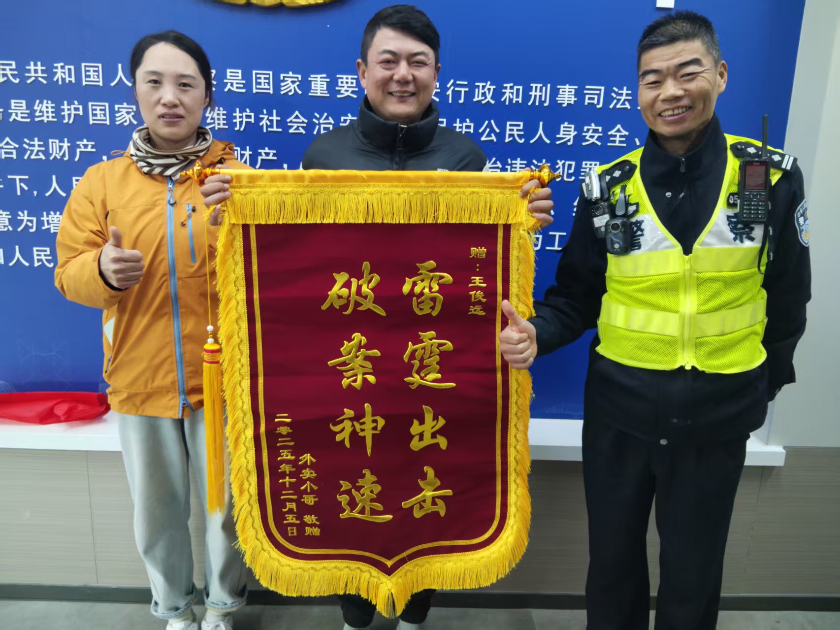 12月4日,宗保公司駐浦東新區臨港新城派出所輔助項目員工王俊遠在協(xié)助民警處置一起警情時(shí),憑借高度的工作責任心與細致耐心的工作態(tài)度,成功幫助市民宋女士追回被盜外賣(mài),贏(yíng)得市民真摯贊譽(yù)。事后,宋女士專(zhuān)程送來(lái)一面繡有“雷霆出擊 破案神速”的錦旗,表達對王俊遠及派出所高效為民工作的充分肯定與衷心感謝。