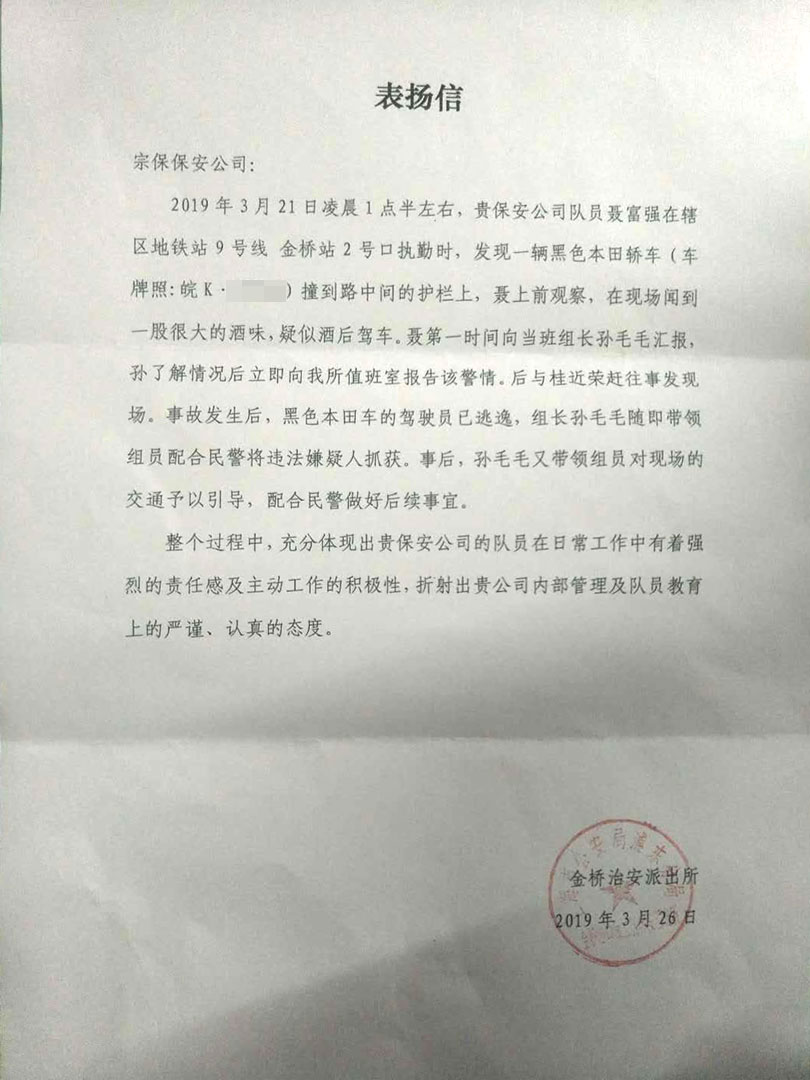 2019年3月26日,宗保駐金橋輔警項目收到一封來(lái)自金橋治安派出所的表?yè)P信,信件是對該項目隊員工作的認可及贊揚。