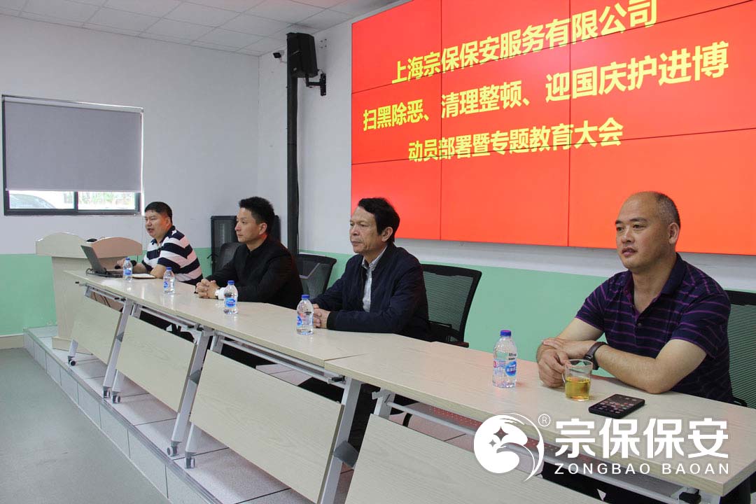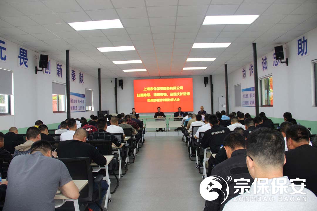 為了全面深入貫徹落實(shí)市治安總隊掃黑除惡專(zhuān)項斗爭工作部署,2019年5月18日上午,上海宗保保安服務(wù)有限公司在申江南路基地召開(kāi)掃黑除惡、清理整治、迎國慶護進(jìn)博動(dòng)員部署暨專(zhuān)題教育大會(huì ),公司項目負責人以上人員全員參加會(huì )議。