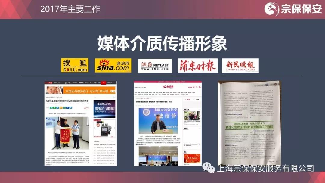 酒香不怕巷子深,由風(fēng)做介質(zhì);好事照樣傳千里,靠媒體傳播。2017年,搜狐網(wǎng)、新浪網(wǎng)、網(wǎng)易、中國新聞網(wǎng)、《新民晚報》、《浦東日報》、《上海城管執法》、《保安與技防》等多家媒體相繼報道公司的正面形象。媒體紛至而來(lái),既是社會(huì )各界對宗保人踏實(shí)工作、文明值勤的認可,更是宗保企業(yè)文化這壇佳釀不斷發(fā)酵、香飄久遠所致。