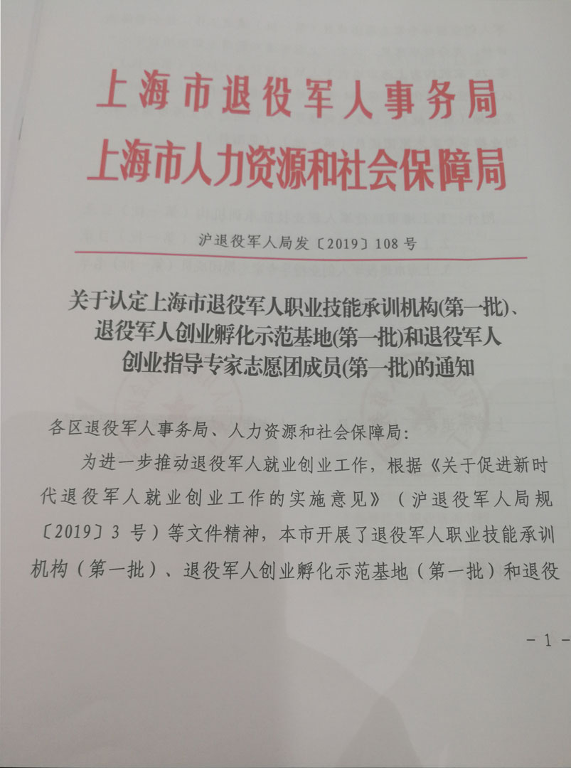 會(huì )上,市人力資源和社會(huì )保障局就業(yè)處副處長(cháng)黃河宣讀了《關(guān)于認定上海市退役軍人職業(yè)技能承訓機構(第一批)、退役軍人創(chuàng )業(yè)孵化示范基地(第一批)和退役軍人創(chuàng )業(yè)指導專(zhuān)家志愿團成員(第一批)的通知》。宗保公司董事長(cháng)馮中保被認定為上海市退役軍人創(chuàng )業(yè)指導專(zhuān)家志愿團成員。
