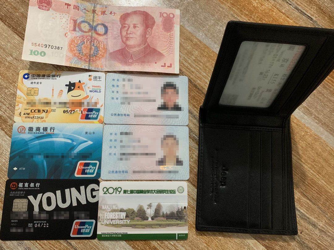 4月1號20:00,宗保公司駐黃山區域湯口市容項目隊員楊興智在湯口鎮沿溪東街巡邏時(shí)撿到一個(gè)錢(qián)包,內有一百元現金一張、銀行卡三張、身份證兩張。