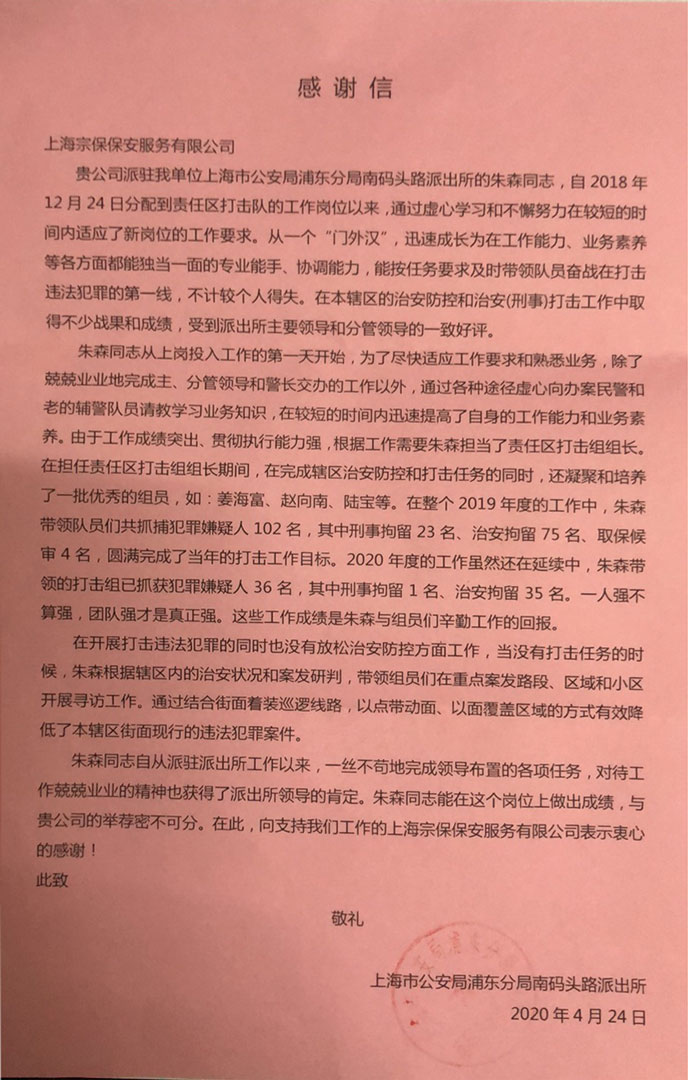 截至4月30日,宗保公司參與疫情防控共出動(dòng)人員43.3萬(wàn)多人次,在19座寺廟(庵)勸離香客,49處路口設卡,6個(gè)地鐵站口檢測進(jìn)出地鐵站人員體溫,3個(gè)高鐵站檢測出站旅客體溫,浦東、虹橋2個(gè)機場(chǎng)4個(gè)候機樓秩序維護,146個(gè)小區門(mén)口檢測進(jìn)入小區人員體溫,76個(gè)集中隔離點(diǎn)值班守護,930多人次接送隔離人員,214戶(hù)居家隔離保障,121個(gè)藥店秩序維持,配合查處活禽交易236起,盤(pán)查人員83.8萬(wàn)多人次、盤(pán)查車(chē)輛21.8萬(wàn)多車(chē)次。