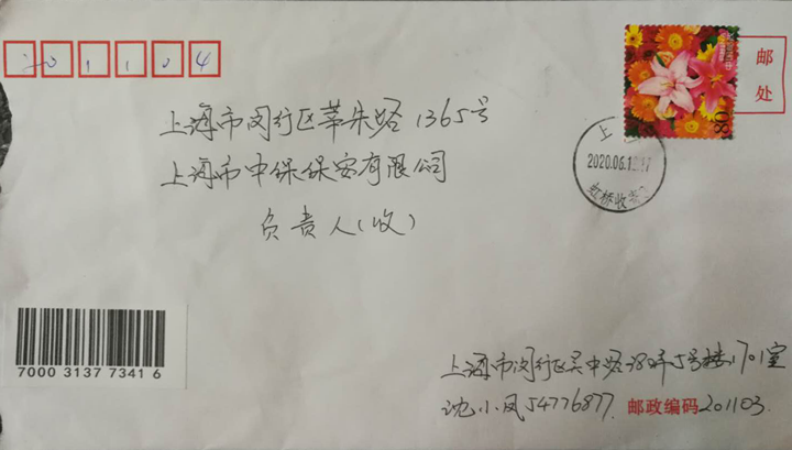 6月12日,宗保公司駐閔行莘莊梅隴交通輔警項目隊員雷志奎收到市民沈小鳳老人家屬寄來(lái)的一封感謝信。