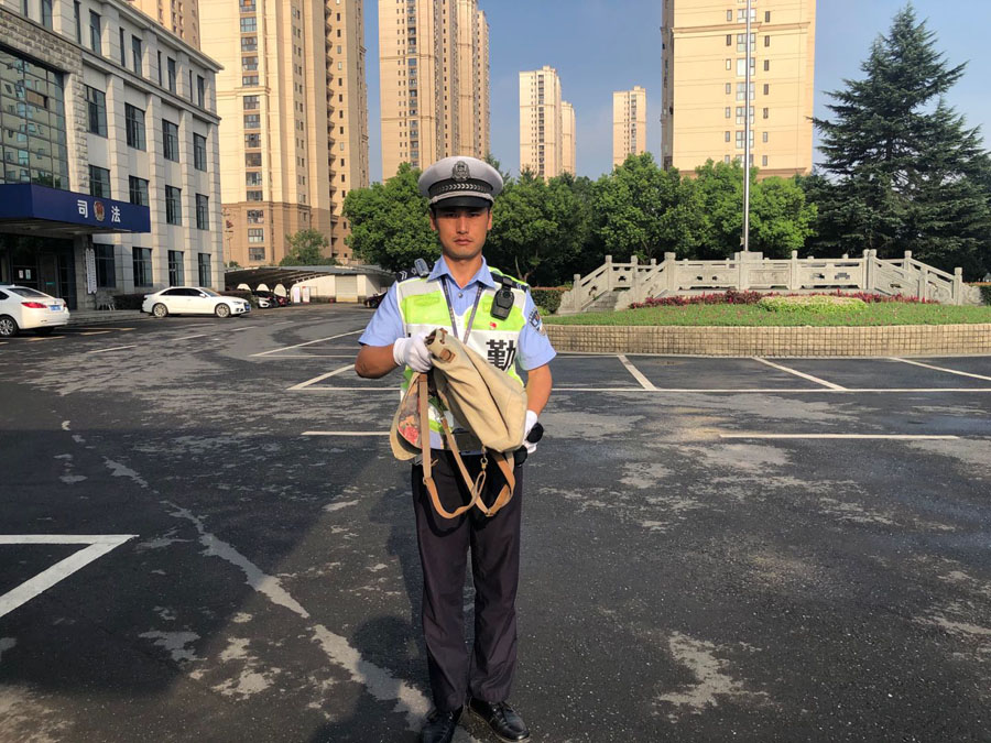 7月22日7:10,浙江民泰駐閑林交通輔警項目隊員張龍、李丹兩人在02省道閑富路北口站高峰崗執勤時(shí),發(fā)現一輛由西向東直行的電動(dòng)車(chē)后座掉落一個(gè)米色背包。張龍趕緊呼叫車(chē)主,可是車(chē)主未能聽(tīng)見(jiàn),繼續向前行駛。