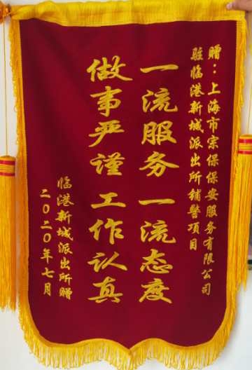 7月31日,臨港新城派出所副所長(cháng)施軍杰將一面繡有“一流服務(wù),一流態(tài)度,做事嚴謹,工作認真”的錦旗送到宗保公司臨港區域項目經(jīng)理王書(shū)劍和隊長(cháng)張龍手中,并合影留念。
