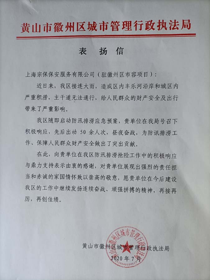8月4日,宗保公司收到一封來(lái)自黃山市徽州區城市管理行政執法局的表?yè)P信,信中對在防汛期間,為防汛排澇工作提供有力支撐的公司駐黃山市徽州市容項目提出表?yè)P。
