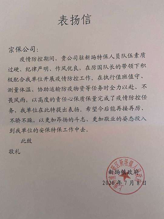 任勞任怨守一線(xiàn) 盡職盡責戰疫情——公司駐新場(chǎng)鎮政府門(mén)衛項目收到甲方表?yè)P信