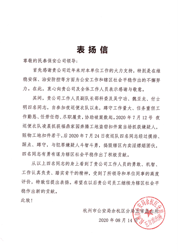8月17日,浙江民泰駐五常輔警項目收到了五常派出所送來(lái)的一封表?yè)P信,特別對項目副隊長(cháng)邵科委等四名隊員提出表?yè)P。