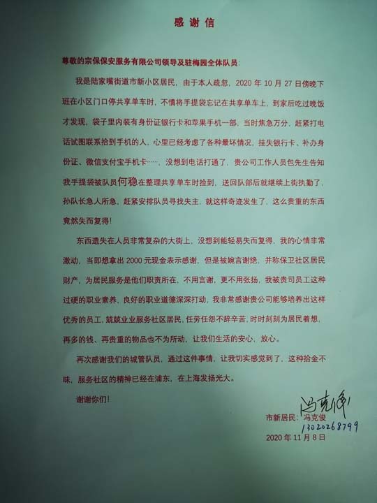 供稿人:李杰11月15日,宗保公司駐莘莊梅隴項目隊員付志勇?lián)斓绞謾C歸還失主,獲得感謝。